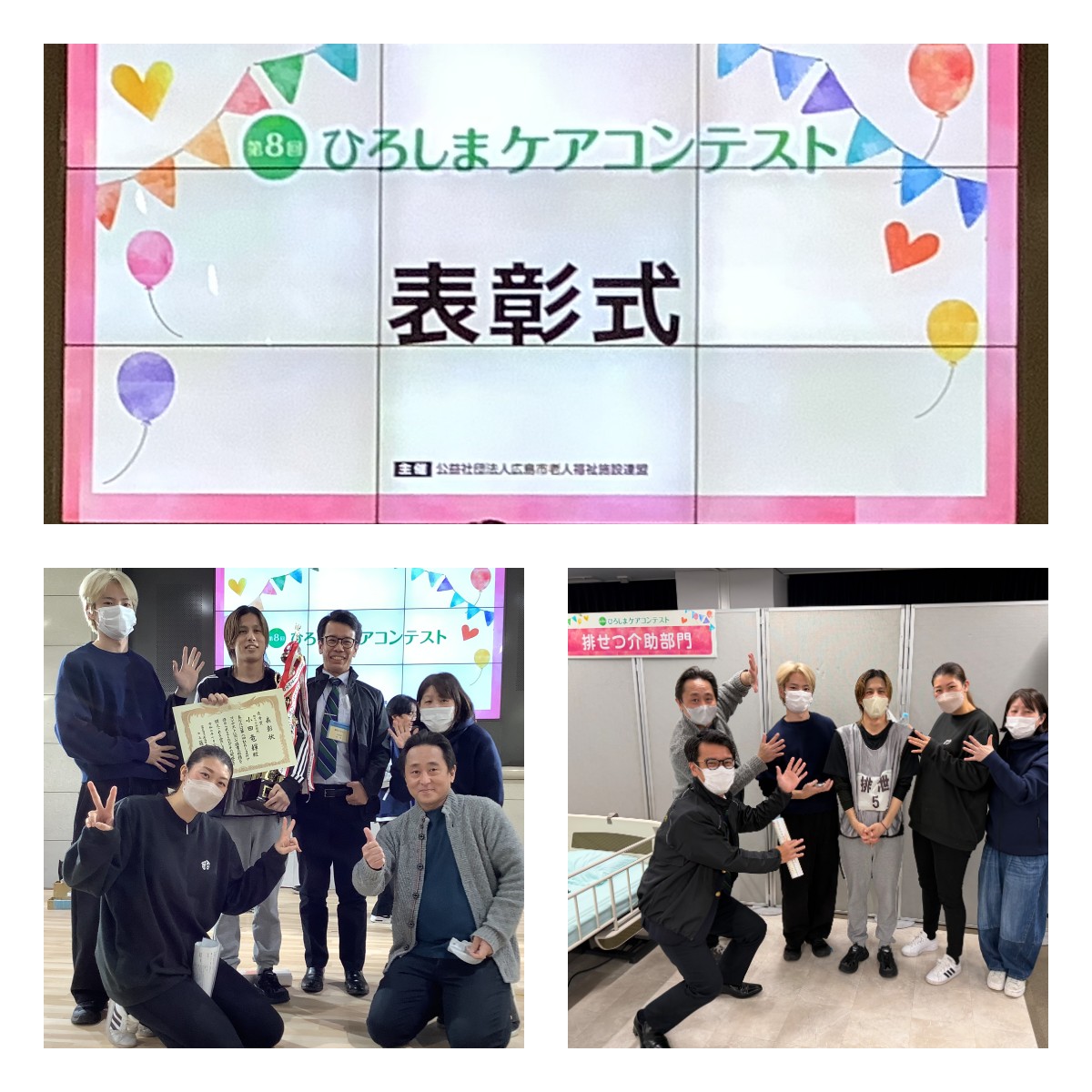 このコンテストには毎年出場していますが、優勝までできたのは初めてのことです! このことは小田介護士の努力はもちろんのことですが、介護意識、介護技術向上を目指し日々共に切磋琢磨している仲間たちの力もあると思います。今回評価していただいことは本当に光栄なことと思います!(^^)!
