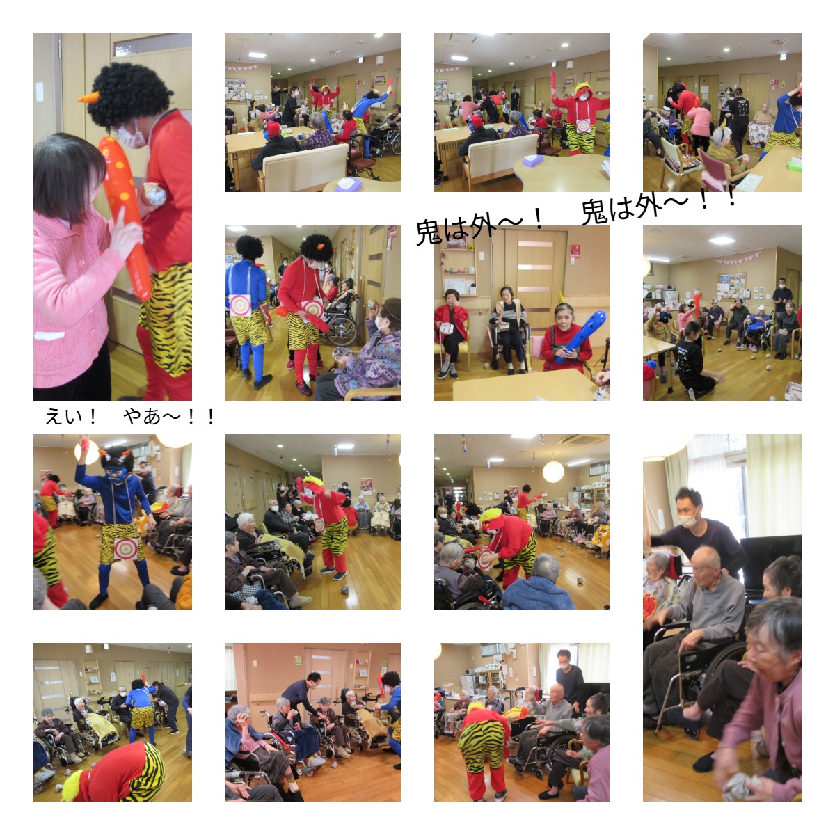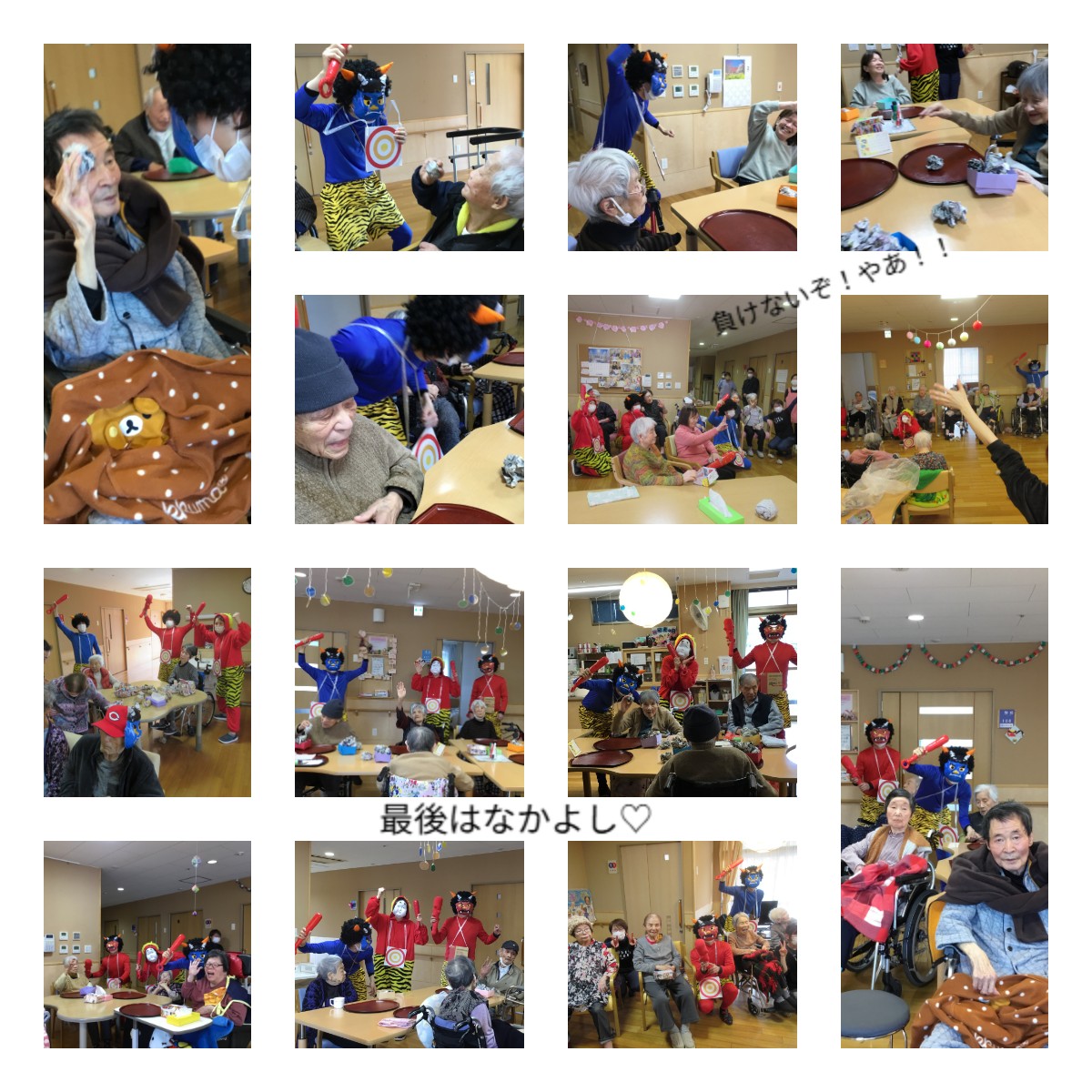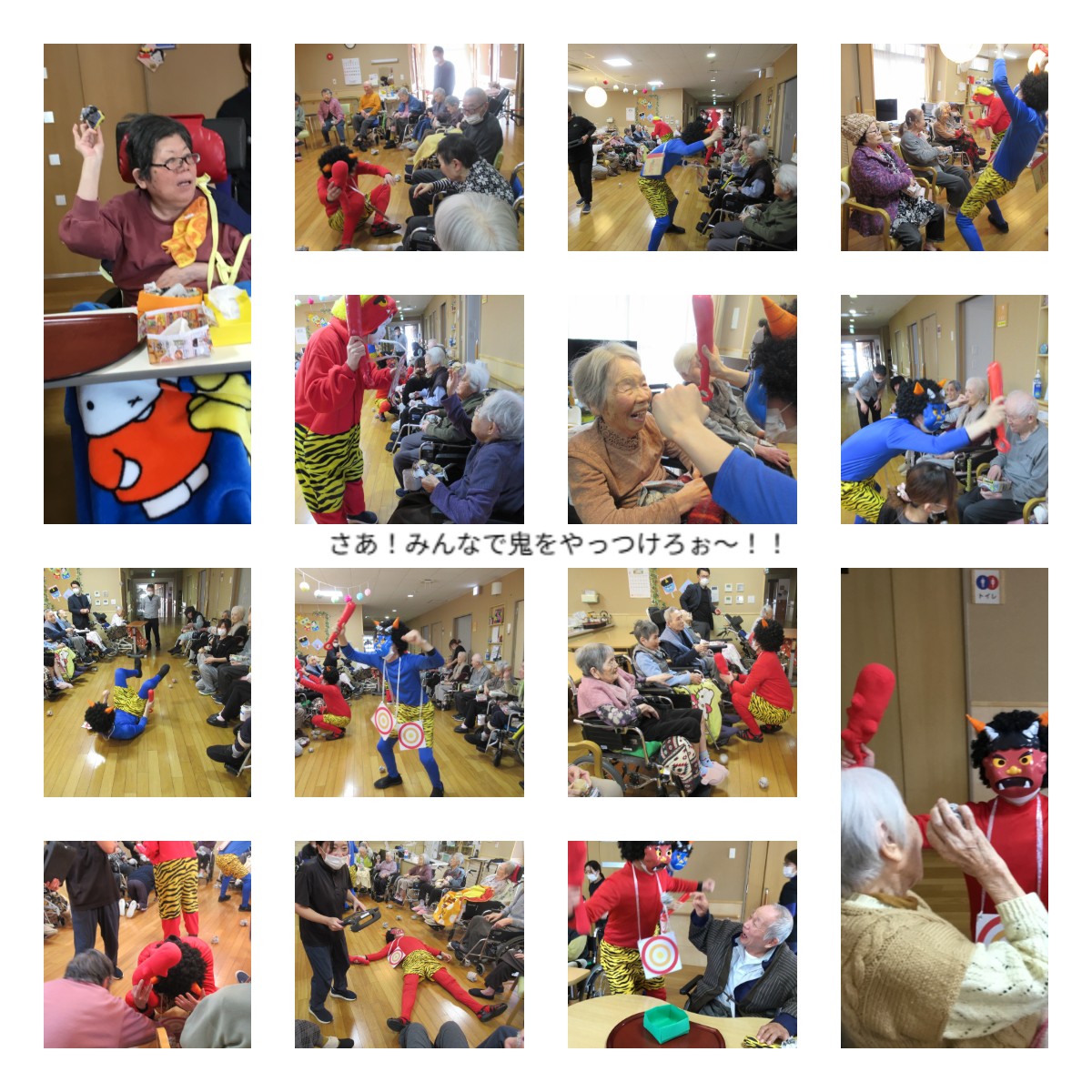 節分"(-""-)" 2026年 2月 3日 Tue 管理者 今日は節分ですね~、亀山の里でも恒例の裏山?の鬼たちがやって来ました!! 「がおぉ~!がおぉ~!」とやっては来たものの、待ち構えていたご入居様に手作り豆玉を投げられ、果ては味方の鬼からも投げられたり!?、指を踏まれたりして踏んだり蹴ったりでした(>_<) 皆さん元気よく「鬼は外~」「やっつけろ~」と豆玉を投げたり、こん棒で鬼を追いかけておしりを叩いてくれたりして、賑やかに邪気を払うことができました!(^^)! 鬼たちも「皆さんからのお仕置きを受けて、今年も悪さをせずにいい子にしておきます」と反省して、最後は仲良く記念写真を撮りましたよ。 また来年も待ってるね~(^^)/