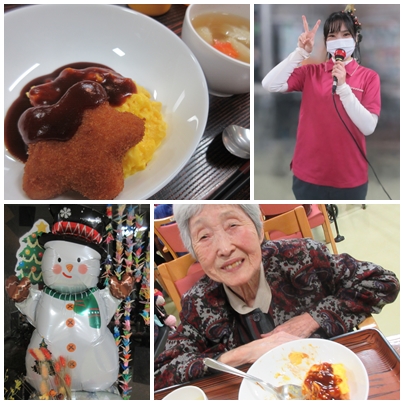 クリスマスイブの夕食 2025年 12月 25日 Thu 管理者 12月24日 クリスマスイブの夕食は、オムハヤシを中心とした温かみのある献立をご提供しました。 星の形をあしらったコロッケや、ロールキャベツスープを添え、見た目にもクリスマスらしさを感じていただける内容となっています。「星のコロッケが可愛いね」「今日は特別じゃね」と、会話も弾み、和やかな夕食の時間となりました。 季節の行事を大切にしながら、食事を通して楽しみや喜びを感じていただけるよう、今後も工夫を続けてまいります。 イベント情報 /ごちそうの日 /行事食