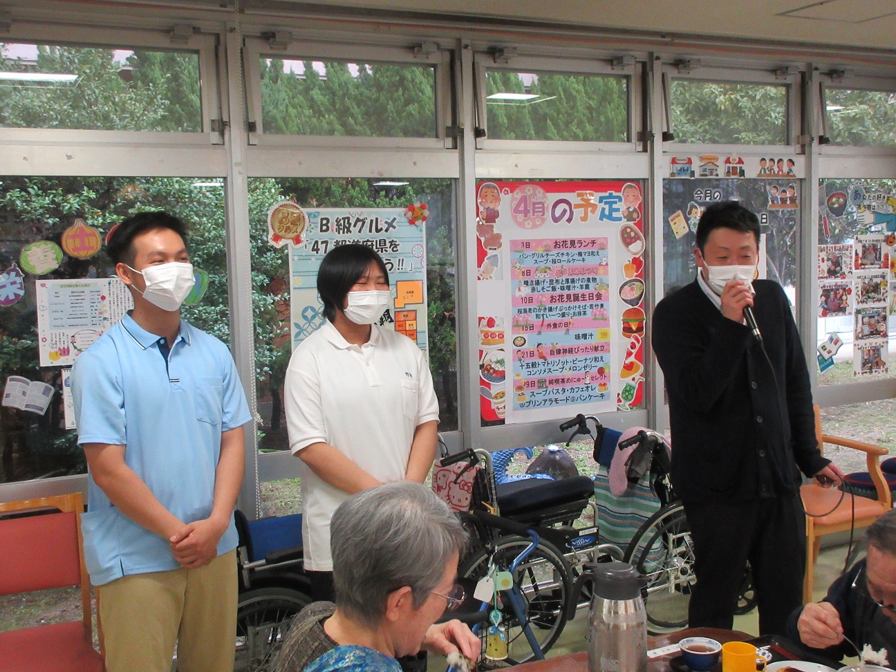 夕食時に新入職員の紹介を行いました 2026年 4月 5日 Sun 管理者 4月1日 辞令交付式を終えた後、夕食の時間に合わせて入居者の皆さまへ新入職員の紹介を行いました。 この日は、竹内介護士とユイ介護士が皆さまの前に立ち、それぞれご挨拶をさせていただきました。少し緊張した様子も見られましたが、温かい拍手に包まれ、和やかな雰囲気の中での紹介となりました。 入居者の皆さまにおかれましても、新たな職員との関わりを楽しみにしていただければと思います。今後ともどうぞよろしくお願いいたします。 お知らせ