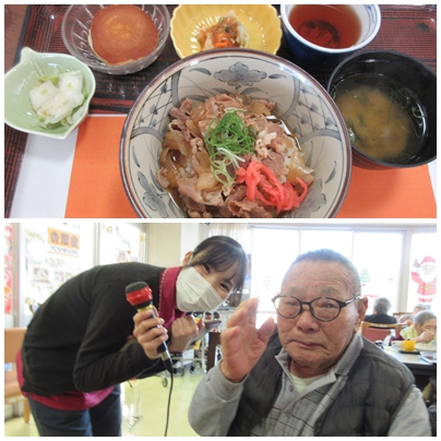 外食の日 牛丼セットを楽しみました 2025年 12月 17日 Wed 管理者 12月16日 外食の日として、牛丼・味噌汁・おしんこ・サラダのセットを楽しみました。 今回は初島様のリクエストもあり、つゆを多めにした牛丼が登場。親和園では、つゆだく派がやや優勢のようで、好みの話で自然と会話も弾んでいました。 イベント情報 /ごちそうの日 /外食の日