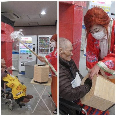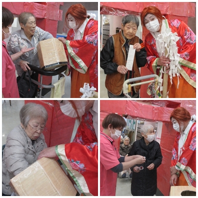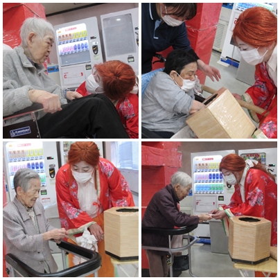 元旦 親和園神社へ初詣 2026年 1月 3日 Sat 管理者 1月1日 元旦 元旦の昼食後、園内に設けた「親和園神社」へ初詣を行いました。 手作りの朱色の鳥居をくぐり、杉井施設長扮する巫女による祈祷のもと、皆さまにおみくじを引いていただきました。 お正月らしい雰囲気の中、穏やかな表情や笑顔が多く見られ、新年の始まりを感じていただけるひとときとなりました。今後も、安心・安全に配慮しながら、季節行事を大切にした取り組みを続けてまいります。 イベント情報 /屋外行事 /季節行事