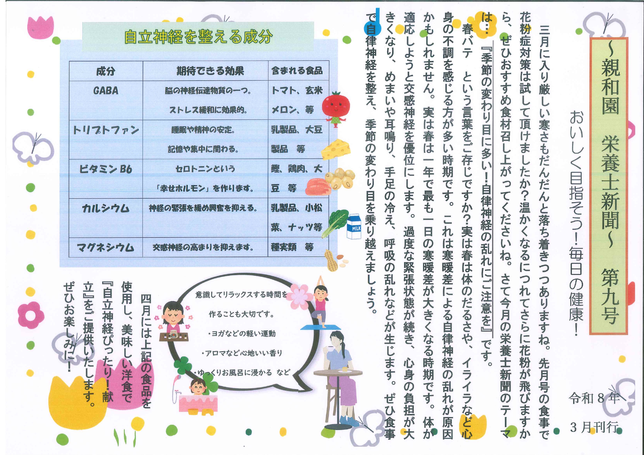 親和園では、入居者の皆さまに日々の食事をより楽しんでいただくとともに、健康面にも配慮した取り組みとして「栄養士新聞」を掲示しています。