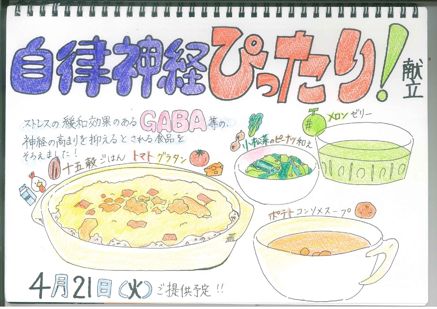 GABAやトリプトファン、ビタミンB6、カルシウムなどの成分と、それらを含む食品についての解説に加え、リラックスのための生活習慣についても触れられており、日常生活に取り入れやすい内容となっています。また、4月21日には、これらの栄養素を取り入れた特別メニューの提供も予定されています。