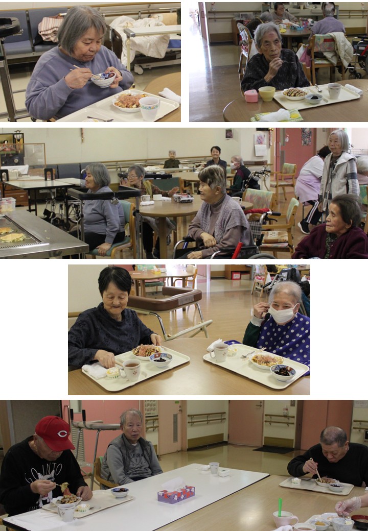 まずは新館1階からスタート!利用者様が見守る中、鉄板で調理していきます。焼き始めるとフロアには生地や豚肉の焼ける香ばしい香りが広がり、「美味しそうなね。早く食べたいわ。」「お父ちゃんにも持って帰ってあげたいから余分に焼いてちょうだい。」など、利用者様も興奮のご様子( *´艸`)