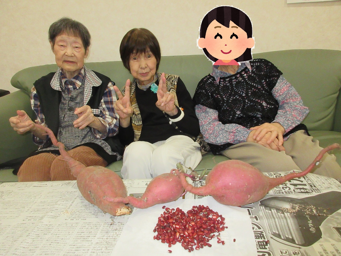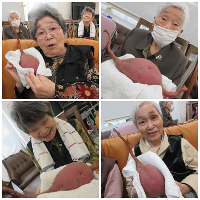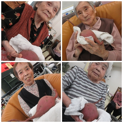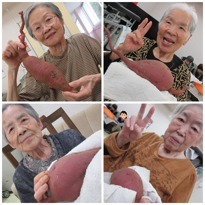 秋といえば”実りの秋”。親和園ミニデイサービスでは、先日職員が収穫したさつまいもを入居者様に披露しました。残念ながら当日は天候不良のため、収穫作業は職員のみでおこないましたが、立派に育ったさつまいもを手に取られた入居者様の表情はとても嬉しそうでした。