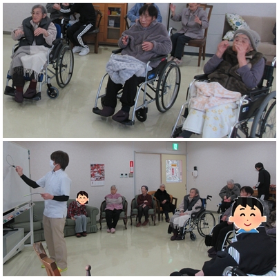 今回は、冬の歌体操(焚き火・エーデルワイス・雪)を取り入れ、歌に合わせて身体を動かしながら、季節を感じていただきました。また、ホワイトボードを使用したイラストクイズにも挑戦。描かれたイラストを見て答えを考えることで、楽しみながら頭を使う時間となりました。