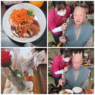 入居者様リクエストの日 2026年 1月 6日 Tue 管理者 1月5日 この日は、藤澤様からの「お肉が食べたい」というリクエストにお応えし、昼食にポークソテーをご用意しました。 また、大正十五年一月五日生まれのお誕生日でもあり、ご家族から贈られた赤いバラが、お祝いの雰囲気をより一層華やかにしてくれました。 お食事の時間には、ゆっくりと味わいながら召し上がるご様子が見られ、心温まるひとときとなりました。 イベント情報 /ごちそうの日 /入居者様リクエスト