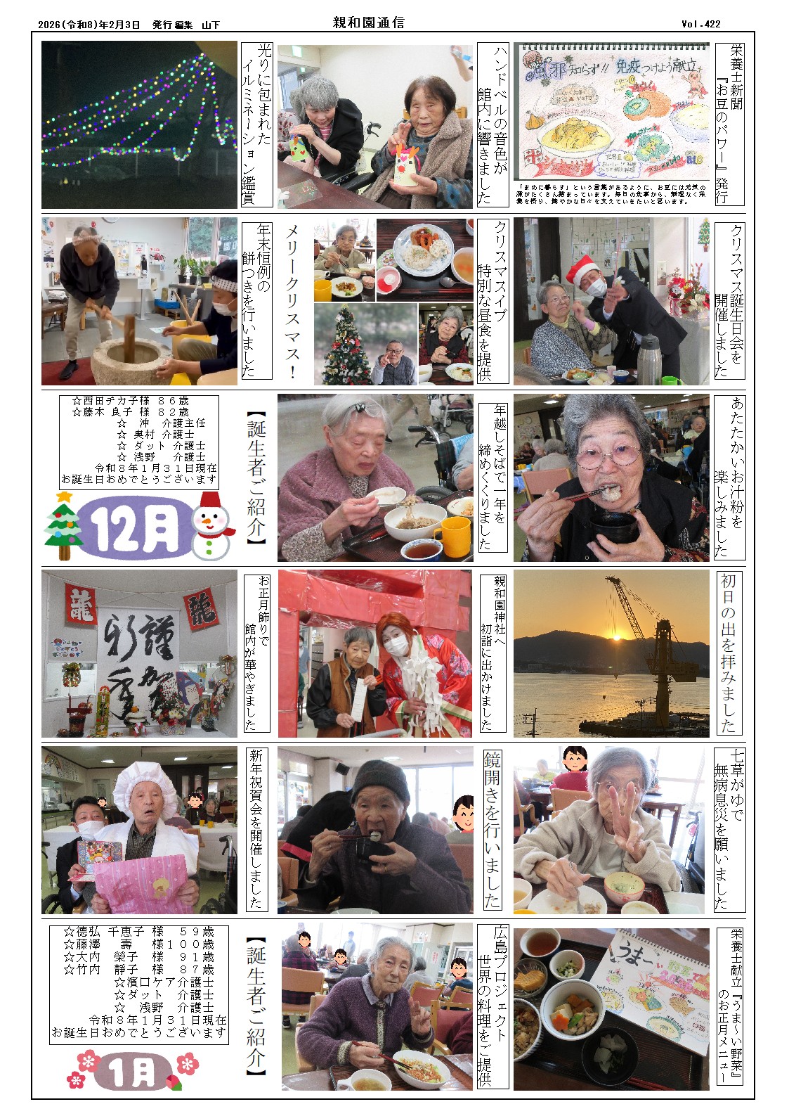 親和園通信 12月・1月号 行事ダイジェスト 2026年 2月 7日 Sat 管理者 2月3日 親和園では、12月から1月にかけて、季節を感じていただけるさまざまな行事を行いました。 クリスマスや年末年始の催し、誕生日会、食を楽しむイベントなど、笑顔あふれるひとときがたくさん生まれました。日々の暮らしの中で感じた楽しさや温もりを、一枚の新聞にまとめています。 これからも、季節の移ろいを大切にしながら、皆さまと共に過ごす時間を積み重ねていきたいと思います。 親和園だより