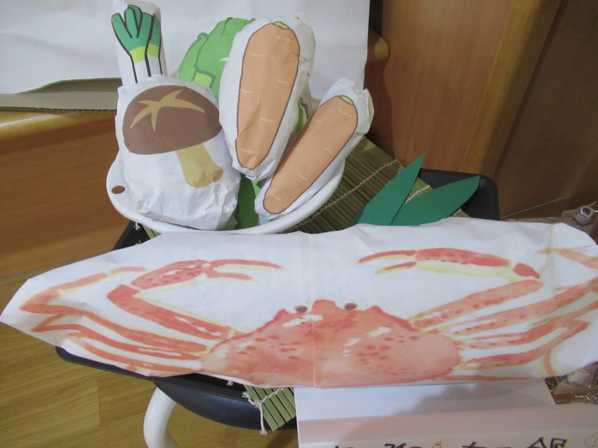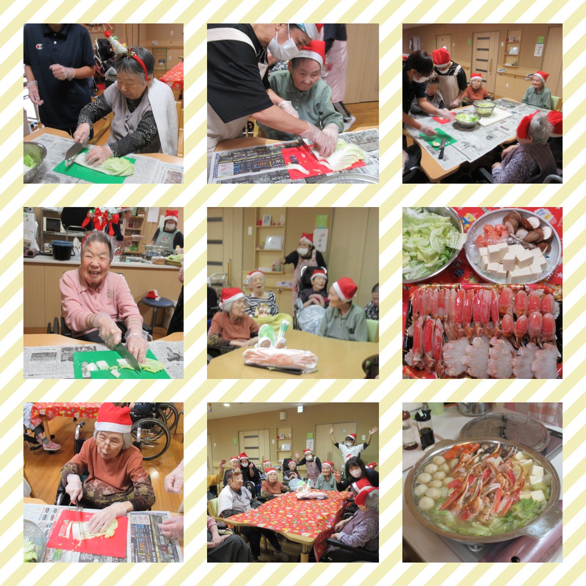 Xmas会「緑ユニット」 2025年 12月 25日 Thu 管理者 クリスマスと言えば、鶏肉のローストや洋風なお料理がイメージですが、やっぱり私達にはこの季節はお鍋がご馳走ですよね♪ 「緑ユニット」ではここ何年か恒例となっている【カニ鍋】をクリスマスメニューに選んで、亀山の里菜園で育てた白菜を具材としました! まずはじめに、職員手作りの具材の模型を囲んでカニ鍋の準備手順や、「白菜は皆さんで植えた白菜ですよ~」「カニは山陰・境港から届きましたぁ!」など談義に花を咲かせ、次に皆さんで白菜を切ってもらいました!(^^)! 出来上がったカニ鍋は匂いもお味も抜群で、しめの雑炊まで美味しく頂きました( ^)o(^ )
