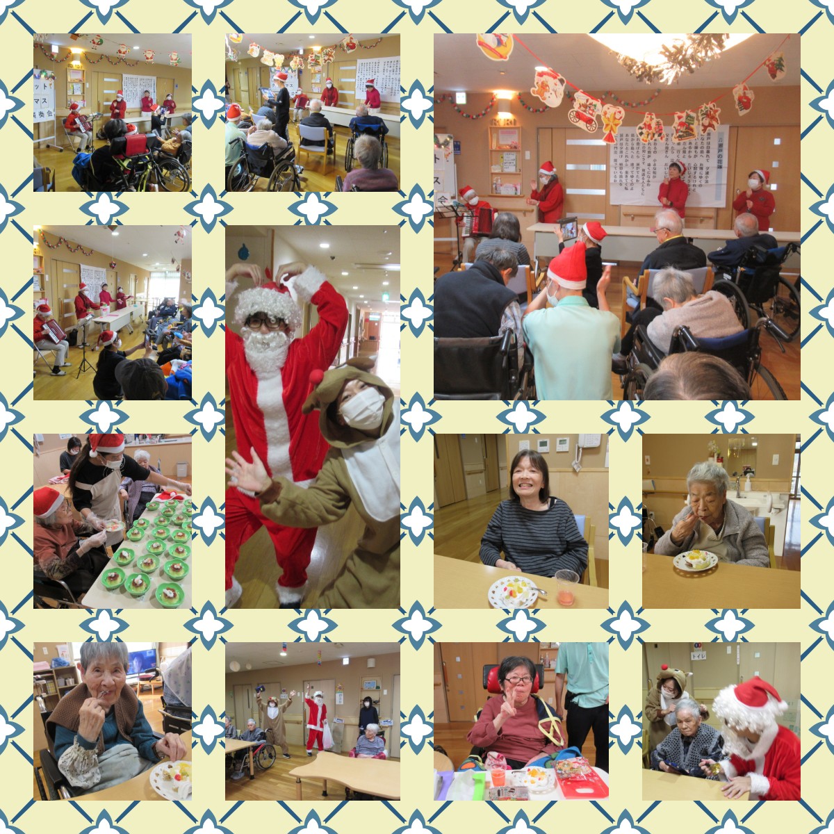 Xmas会「青ユニット」 2025年 12月 25日 Thu 管理者 ボランティアの方に演奏と歌を披露してもらい、クリスマス会を開催しました♪ ケーキとプリンのトッピングは入居者様にお手伝いしてもらい、サンタの登場ではプレゼントの期待も膨らみます(#^.^#) 今夜はいい夢が見れるといいですね~(^^)/ 各ユニットで思い思いの趣向で催したクリスマス会となりました!
