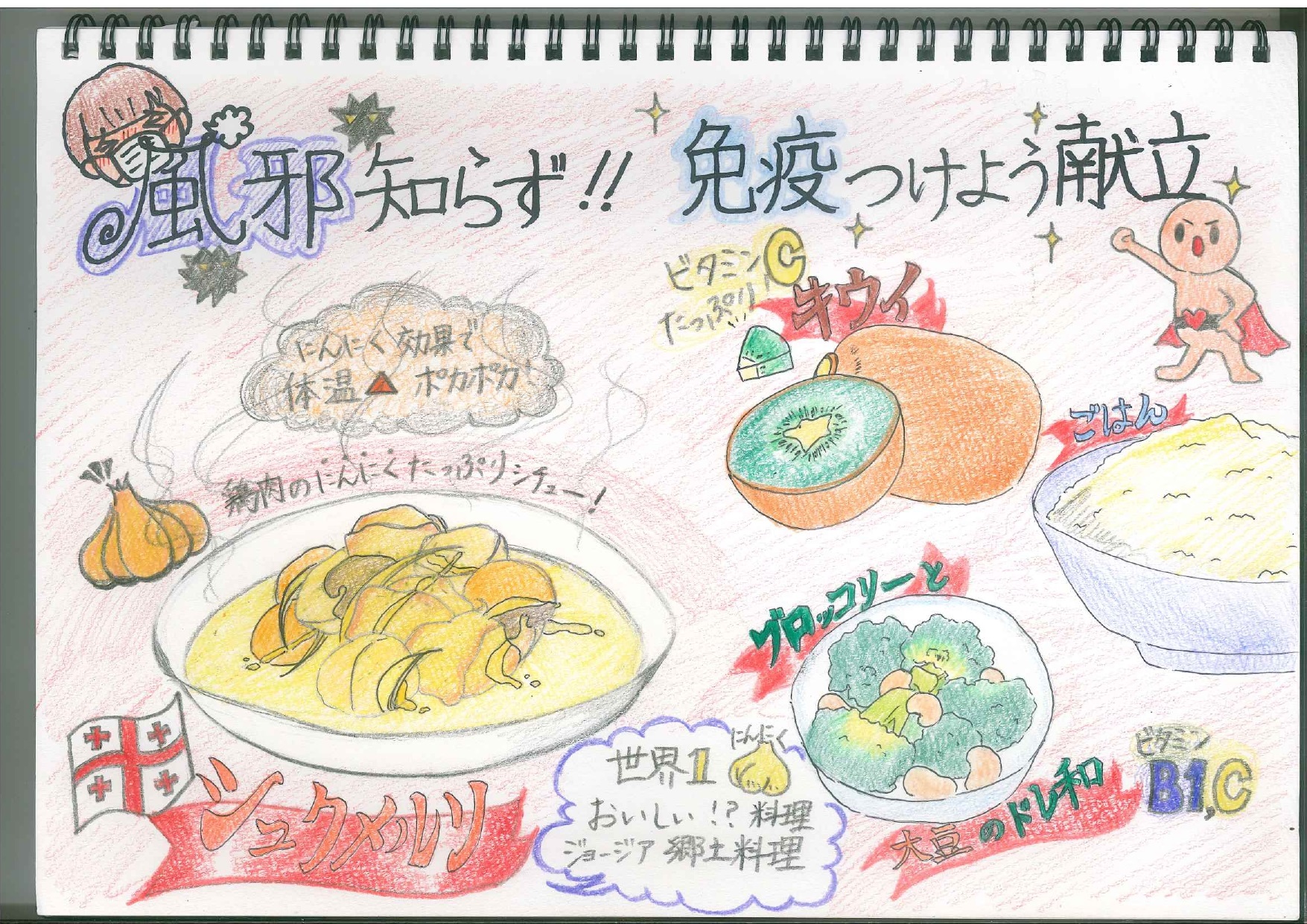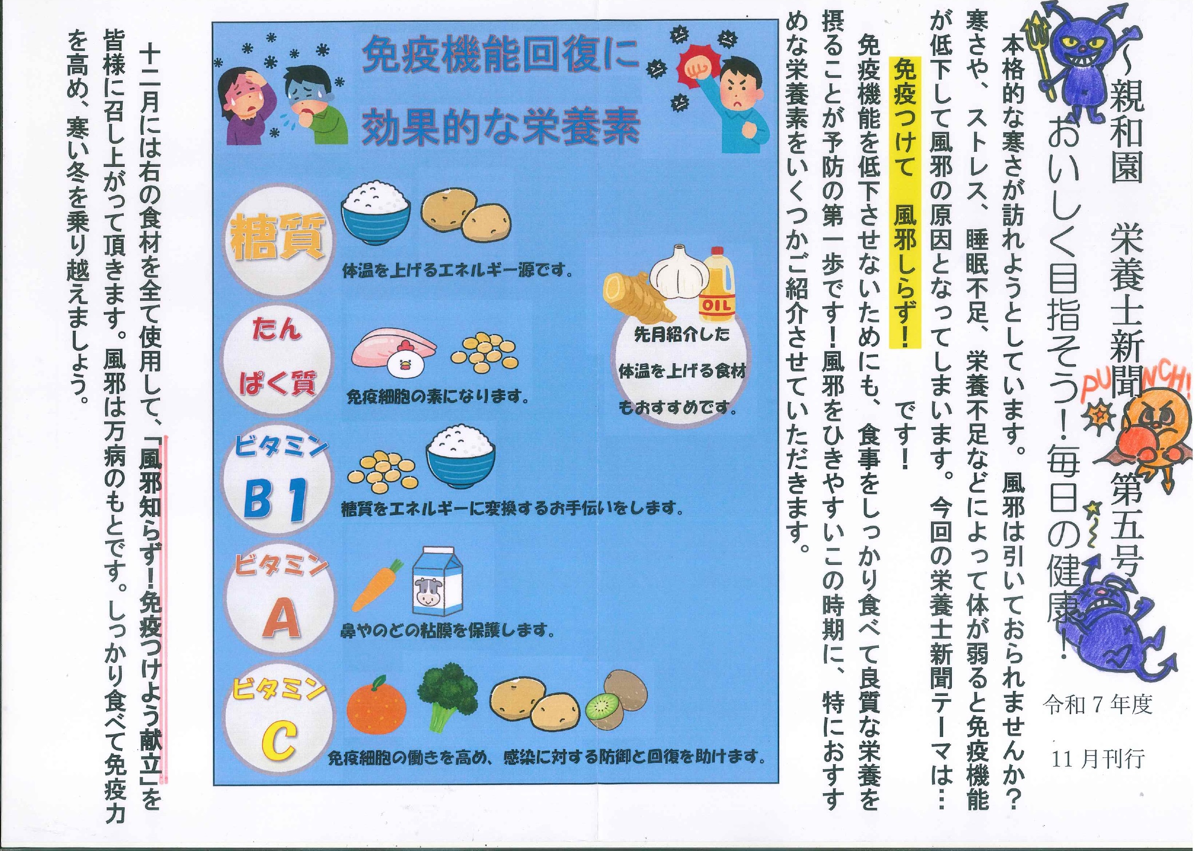 栄養士新聞 12月号を発行しました 2025年 12月 2日 Tue 管理者 12月2日 今月の栄養士新聞では、寒い季節に負けない”免疫力アップ”をテーマに、風邪予防に効果的な栄養素や食材をわかりやすく紹介しています。 糖質・たんぱく質・ビタミンB1・ビタミンA・ビタミンCなど、免疫機能の維持に欠かせない栄養素の働きに加え、日常の食事に取り入れやすい食材や献立例も掲載しています。 今月のおすすめメニューは、身体がぽかぽか温まる「シュクメルリ(鶏肉のにんにくクリーム煮)」をはじめ、ビタミン豊富なブロッコリーの和え物や旬の果物を使った一品など、見た目も楽しく栄養満点の内容となっています。寒さが本格化する季節です。しっかりと食事をとり、免疫力を高めて元気に過ごしていきましょう。 栄養士新聞