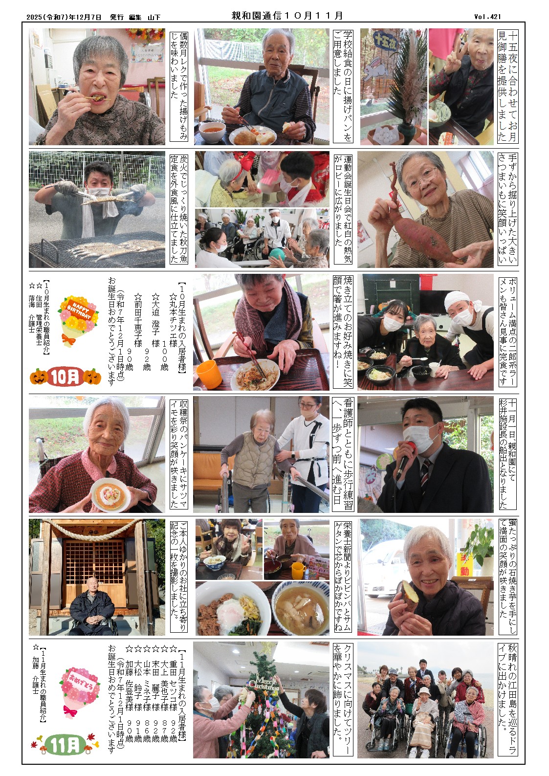 親和園通信 10月・11月の振り返り 2025年 12月 9日 Tue 管理者 12月7日 親和園では、10月・11月の2か月間にさまざまな行事や活動が行われました。焼き芋や秋の味覚を楽しむ催し、外出レクリエーション、文化活動、季節の飾りつけなど、秋ならではの取り組みが盛りだくさん。利用者の皆さまがそれぞれのペースで参加され、たくさんの笑顔が見られました。 今回の親和園通信では、そんな秋の思い出を写真とともに振り返っています。今後も、季節を感じられる取り組みを通して、より豊かな暮らしをご提供してまいります。 親和園だより