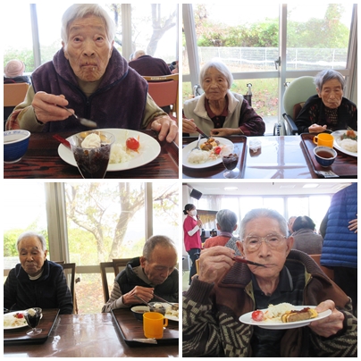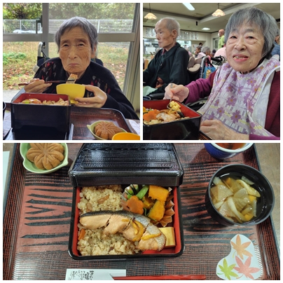秋の行楽弁当を楽しみました 2025年 12月 1日 Mon 管理者 11月27日 紅葉狩りドライブツアーを同じ日、施設での昼食には”秋の行楽弁当”をご用意しました。彩り豊かなおかずが並び、見た目も華やかな特別メニューです。 旬の食材を取り入れた内容で、皆さま「豪華じゃねぇ」「美味しいね」と笑顔で楽しまれていました。秋の味覚を満喫できる、心温まるランチタイムとなりました。 イベント情報 /ごちそうの日 /行事食