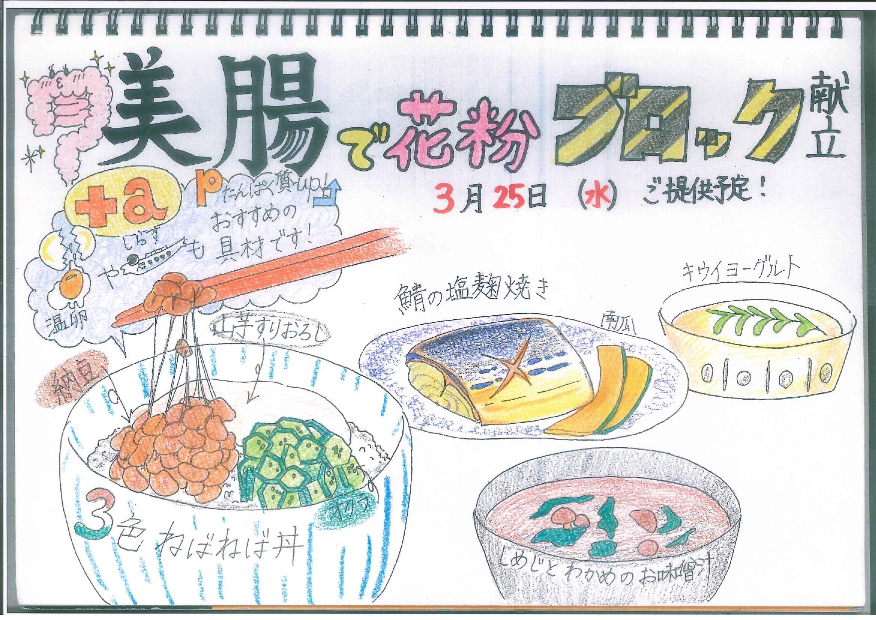 また、3月25日に提供予定の「美腸で花粉ブロック献立」も紹介されており、食事を通して健康づくりを考える内容となっています。