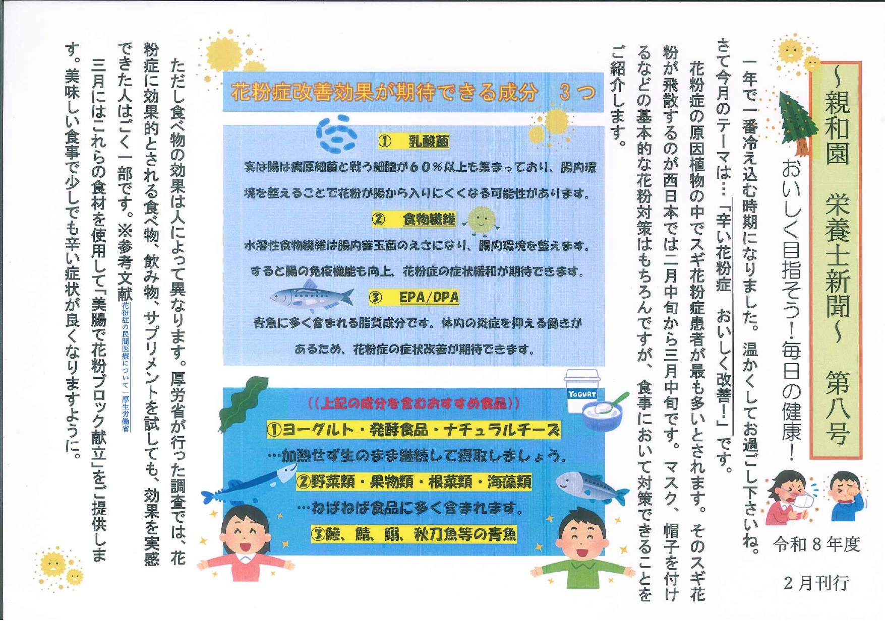 2月号のテーマは「花粉症対策」。花粉症の症状改善が期待できる栄養素として、乳酸菌・食物繊維・EPA/DPAなどを紹介し、それらを多く含む食品について分かりやすく解説しています。腸内環境を整えることが、花粉症対策にもつながるというお話に、皆さまも興味深くご覧になっていました。