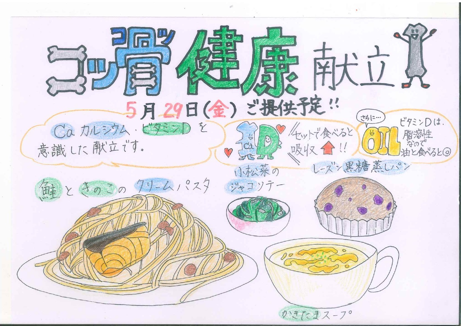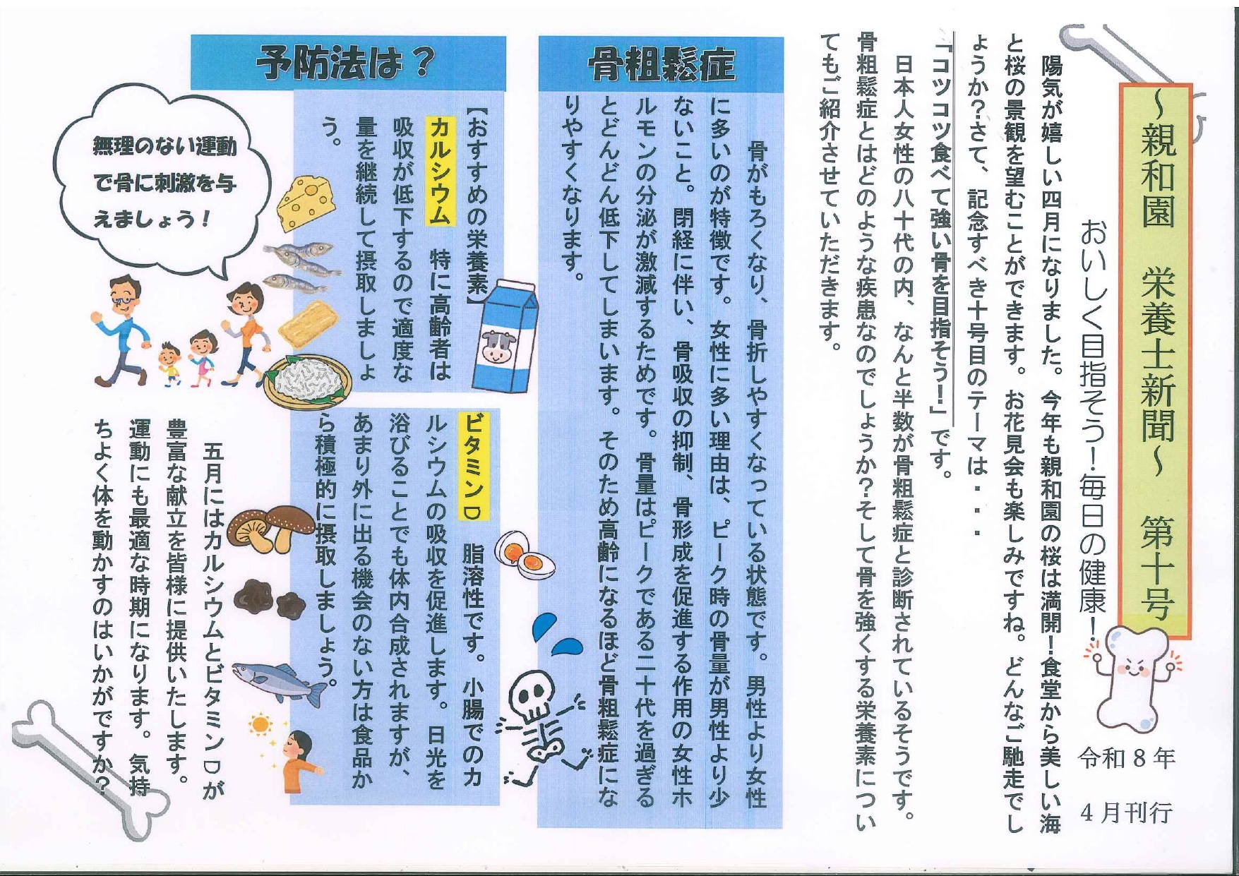 栄養士新聞 第十号を掲示しました 2026年 4月 17日 Fri 管理者 4月17日 親和園にて、栄養士新聞 第十号を掲示しました。 今月は「骨密度献立」をテーマに、カルシウムやビタミンDを意識したお食事や、骨の健康を保つためのポイントを分かりやすくまとめています。 見やすく親しみやすい内容となっておりますので、施設へお越しの際はぜひご覧ください。 栄養士新聞