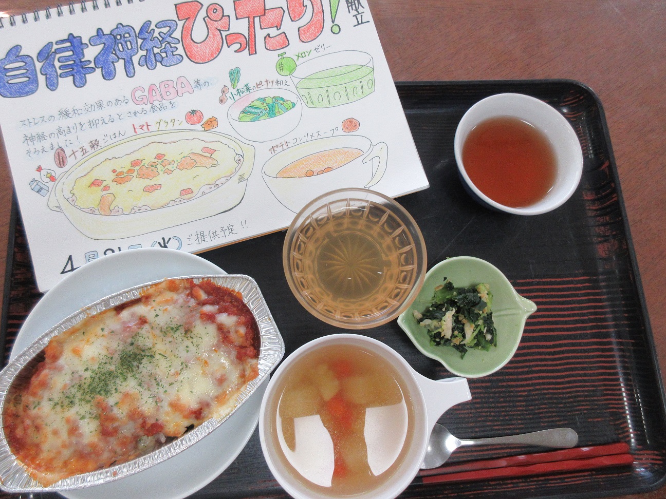 香り広がる春のひととき ~自律神経ぴったり献立~ 2026年 4月 21日 Tue 管理者 4月21日 本日の昼食は、栄養士献立より「自律神経ぴったり献立!」と題したメニューを提供しました。 ストレスの緩和に効果が期待されるGABAを含む食材を取り入れ、十五穀ごはんのトマトグラタンを中心に、彩り豊かな副菜やスープ、デザートを組み合わせた内容となっています。 提供時には、チーズとトマトソースの香ばしい香りが親和園内に広がり、食欲をそそるひとときとなりました。入居者様からも「おいしいね」と笑顔が見られ、楽しく召し上がっていただけたご様子でした。 イベント情報/ごちそうの日/栄養士健康メニュー 栄養士新聞