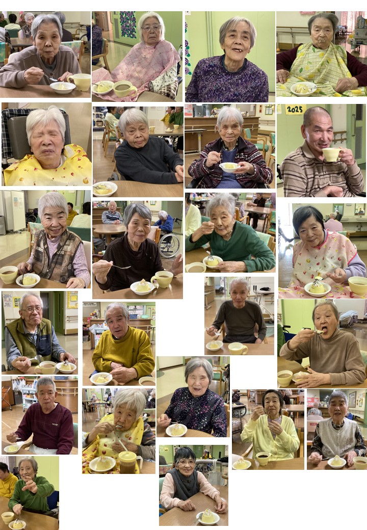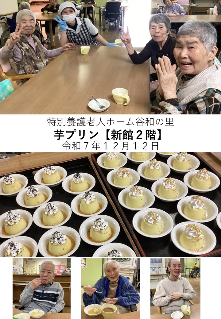 芋プリン【新館2階】 2025年 12月 12日 Fri 管理者 前回の焼いもに続き、さつまいものおやつを提供させていただきました♪ 今回のメニューは「芋プリン」だったのですが、「大学いも風」と「チョコスプレー」の2種類からお好きな方を選んでいただきました(*'▽')/ 皆さんの召し上がる様子をご紹介します。甘くて美味しいスイーツにニッコリ笑顔です。 施設イベント